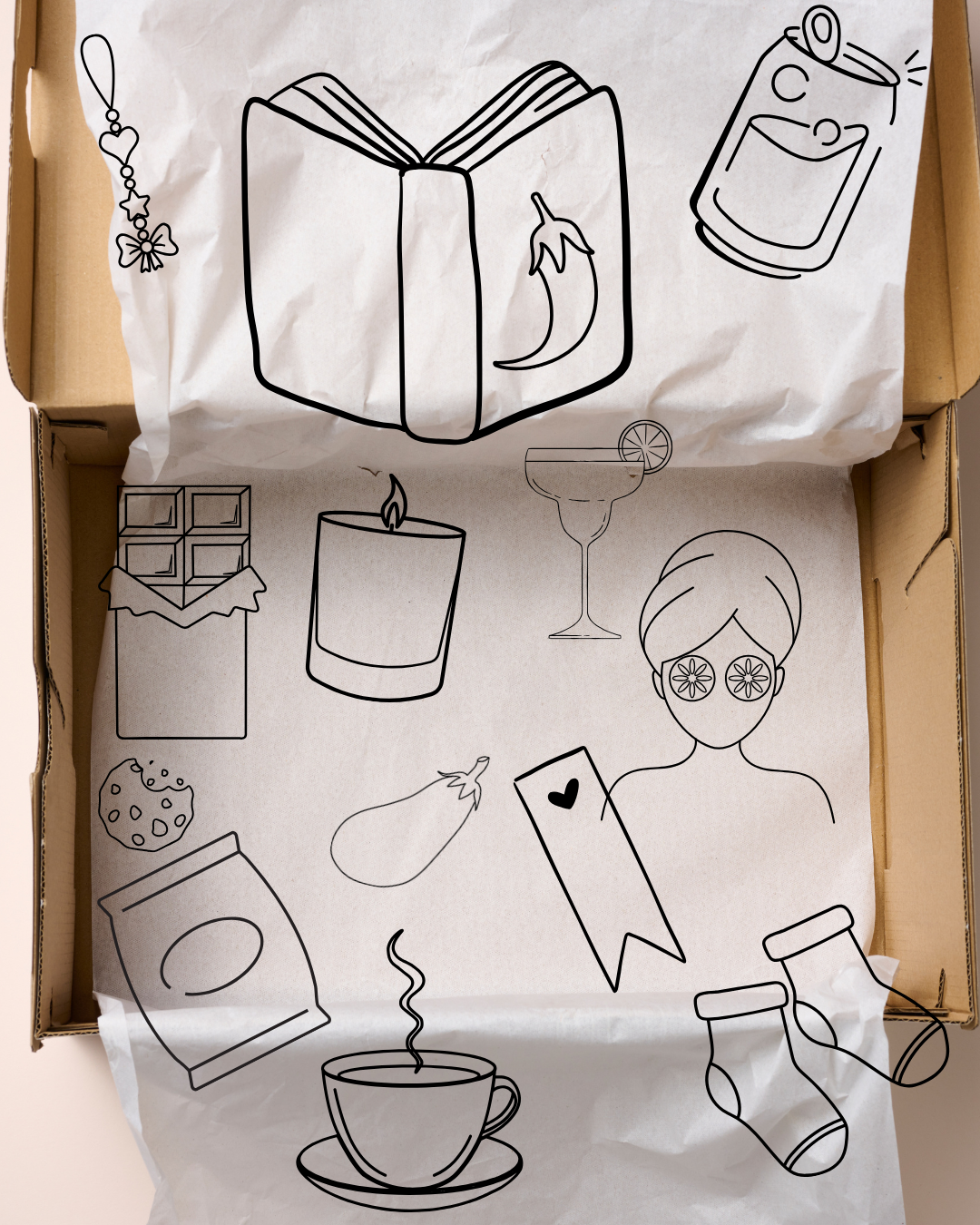 Receive a spicy book chosen by our team of romance readers. With the book you will receive 5+ themed goodies, ranging from sweet treats to self-care items.